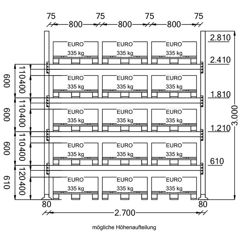 Alle Lastangaben gelten bei einer Fachhöhe von 1200 mm sowie für eine gleichmäßig verteilte Last. Die Palettenregale sind nicht zur Aufstellung im Außenbereich geeignet.